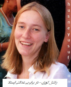 "راشل" هرگز این واژه ها را تا بحال نشنیده بود، او یک مسلمان نبود، اما او احساس مسئولیت و تکلیف کرده بود برای ایستادگی در برابر بی عدالتی، بنابراین او به فلسطین رفت. او در برابر این بولدوزر ارتش اسرائیل ایستاده بود، برای دفاع از یک خانه و خانواده فلسطینی که نابود نشوند. بولدوزر مستقیماُ از روی او رد می شود؛ دو مرتبه؛ بدنش خرد شده و او زندگی اش را از دست می دهد. آری او برای عدالت ایستادگی کرد در 16 مارس سال 2003 .